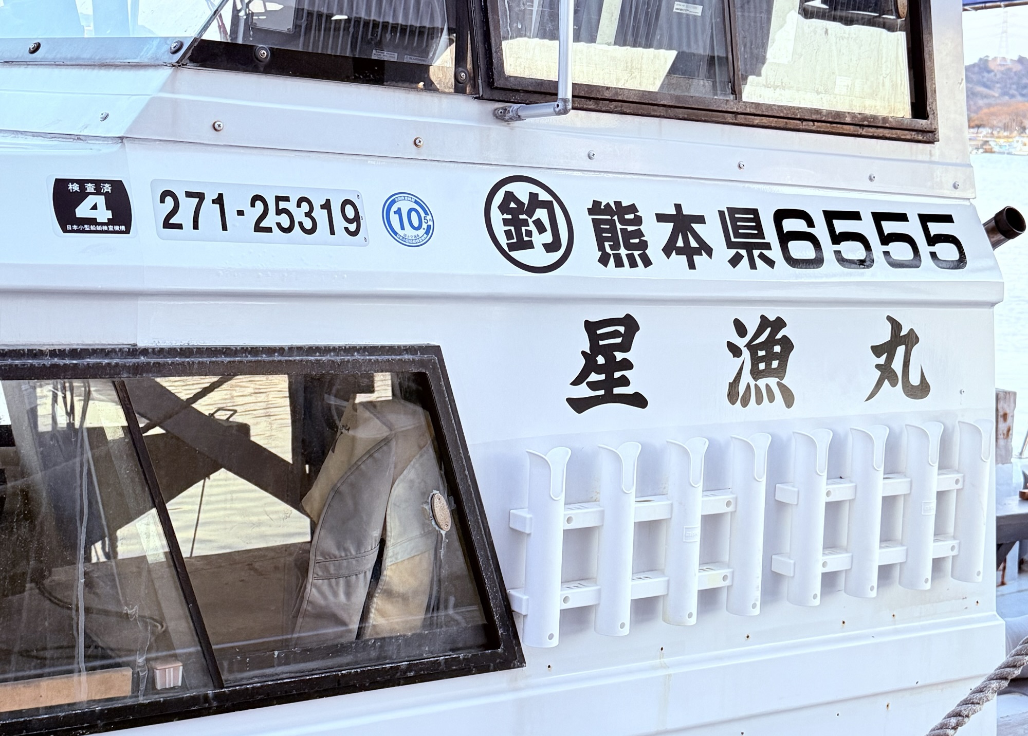 係留場所と集合場所が違うの為、指定の時刻に三角東港の定期船乗り場の桟橋にてお待ち頂く形となります。「星漁丸」が着岸後、お足元にご注意頂きご乗船ください。他のお客様の荷物もお互い協力しあって船に積み込んで頂けると助かります。ロッドはロッドホルダーへ差し込んでください。