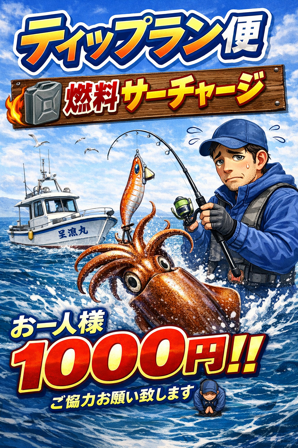 いかなる理由においても、お客様都合によるキャンセルはキャンセル料金をいただきます。シケ等による船長判断の中止は、もちろんキャンセル料金は発生しません。 出船時間に遅刻した場合は当日キャンセルと判断し、キャンセル料金を請求させていただきます。乗船場所には余裕を持ってお越しください。お互い嫌な思いをしない為にも、ご理解いただけますよう、お願いいたします。