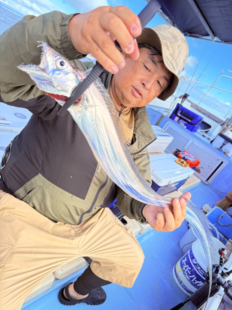 昨日よりサイズ良いのが混じり、イカ夜焚きシーズンを終え久々ご乗船のレジェンド岡本様がタチウオ復帰戦一発目で本日最大の指4本をテンヤでキャッチ❗️流石レジェンドですね😆👍