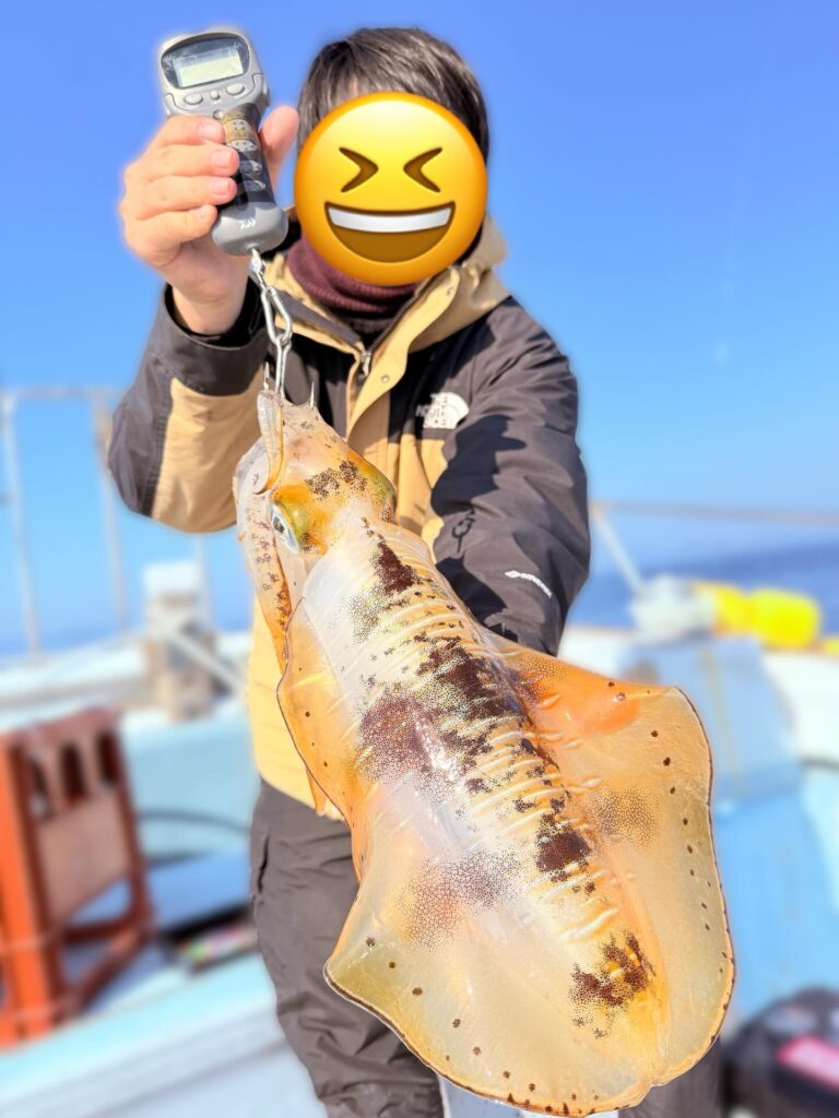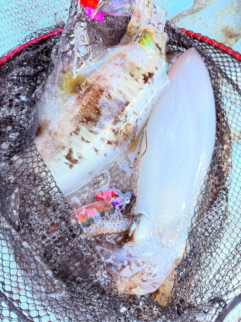 今日も朝からキロ超え降臨で出だし好調😍少人数での出船だったので船長も楽しませて頂く事に🎣早速お客様とダブルヒット🦑🦑仲良く1つのタモでネットイン🤣👌